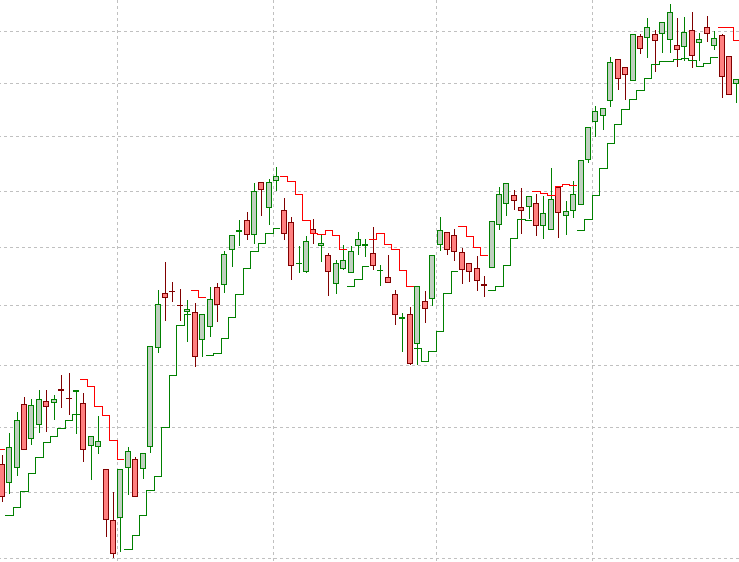 Pode-se observar no gráfico acima a formação das escadas abaixo dos Candles durante as tendências de alta e acima durante as tendências de baixa. O “segredo” do HiLo é alternar entre qual escada ele desenha permitindo a qualquer um interpretar a tendência com uma rápida leitura do gráfico.