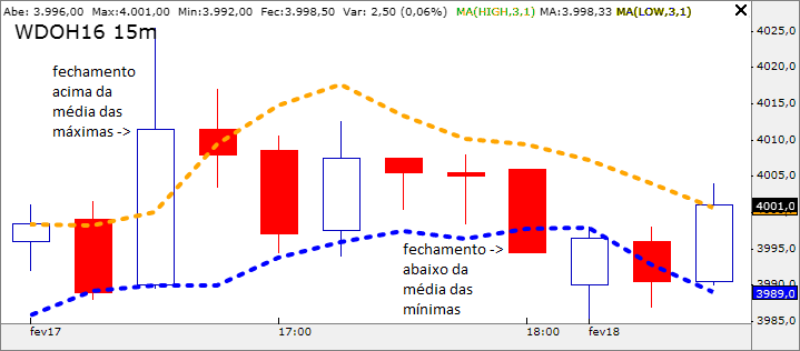 Essas médias são a base do desenho do HiLo. As médias das máximas acima do gráfico são exatamente iguais ao valor das escadinhas desenhadas. Porém, parte da “inteligência” do indicador é escolher quando traçar a escada abaixo ou acima dos candles. Para a escolha do sentido de traçado, traça-se o indicador acima dos candles após um fechamento abaixo da média deslocada das mínimas e traça-se o indicador abaixo dos candles após um fechamento acima da média deslocada das máximas.