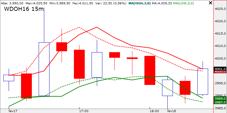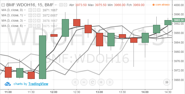 O gráfico mostra a média móvel de 3 períodos. calculada sobre o fechamento dos candles de 15′ do mini dólar futuro (linha mais escura). Essa mesma média foi replicada 3 vezes, porém deslocada 1, 3 e 6 períodos (linhas cinzas). Perceba como elas formam as mesmas linhas e só estão horizontalmente espaçadas, mantendo inclusive a mesma altura, máximos, mínimos, dentre outras características.