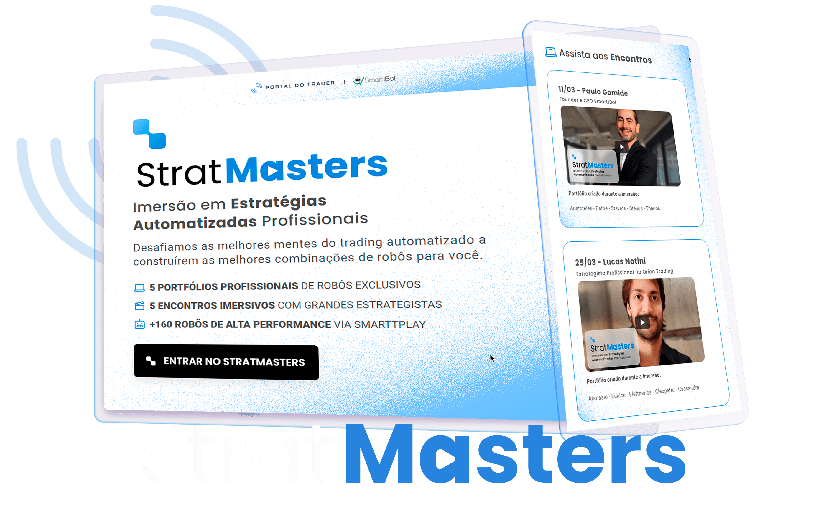O StratMasters é um treinamento imersivo de automação com uma abordagem totalmente prática. Desafiamos grandes especialistas a montar portfólios de robôs para você executar na prática.